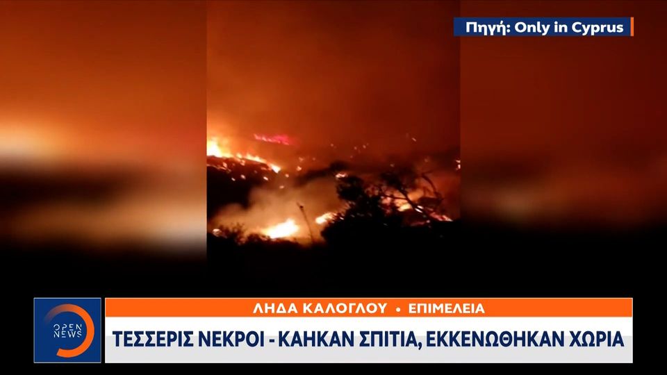 Νεκροί ανασύρθηκαν οι τέσσερις μέχρι πρότινος αγνοούμενοι από τη μεγάλη φωτιά που μαίνεται στην κύπρο.τα τέσσερα άτομα απανθρακώθηκαν στην προσπάθειά τους να ξεφύγουν από το πύρινο μέτωπο που βρισκόταν σε εξέλιξη. Καλογρίτσα με την οικογένεια χούρι. 61 δασικές πυρκαγιές ξέσπασαν το τελευταίο 24ωρο στη χώρα Μεγάλων διαστάσεων πυρκαγιά ξέσπασε στην κοινότητα αρακαπά, στην επαρχία λεμεσού, στην κύπρο. Εκκενώθηκαν οικισμοί και χωριά στην κεφαλονιά.
